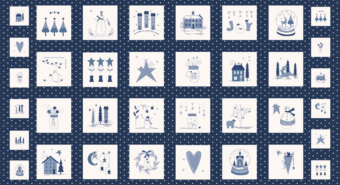This delightful fabric features a series of whimsical winter-themed squares, each adorned with intricate designs like snowflakes, stars, and festive trees. The calming blue and white palette brings a serene, cozy feel, perfect for creating a warm and inviting quilt.