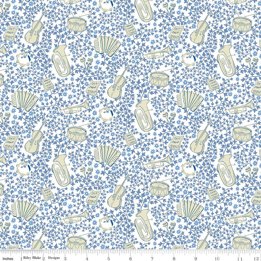 Liberty Fabrics are traditionally screen printed onto soft Lasenby cotton. This base is suited for craft projects, apparel, and classic patchwork quilting. The possibilities are as endless as your imagination. This charming conversational was hand painted in the Liberty Design Studio and features delicately drawn trumpets, drums and accordions laying amongst twisting leaf laden vines and dainty flowers.