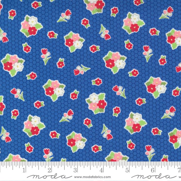 Floral quilting fabric in vibrant blue by Moda Fabrics. This delightful fabric features a charming pattern of red and pink flowers scattered across a rich blue background, creating a lively and cheerful design. Perfect for adding a touch of whimsy and color to your quilting projects.