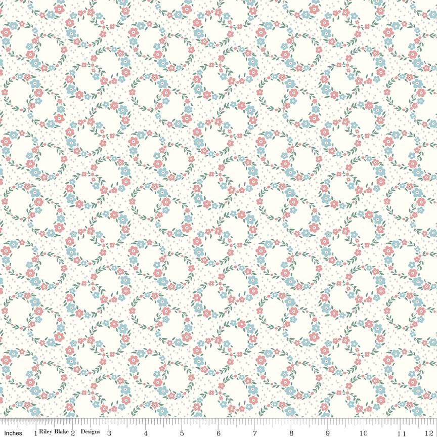 Mary Catherine by Amy Smart for Riley Blake Designs is great for quilting, apparel and home decor. This print features overlapping wreaths of flowers.