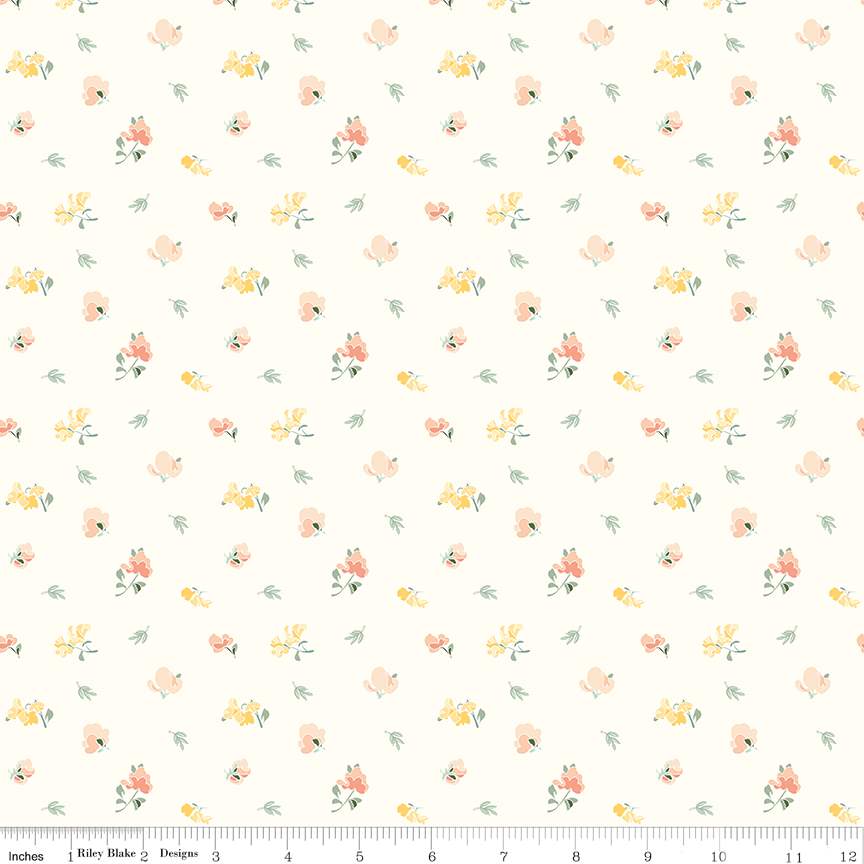 New Beginnings by Sandy Gervais for Riley Blake Designs is great for quilting, apparel and home decor. This print features scattered flowers and leaves.