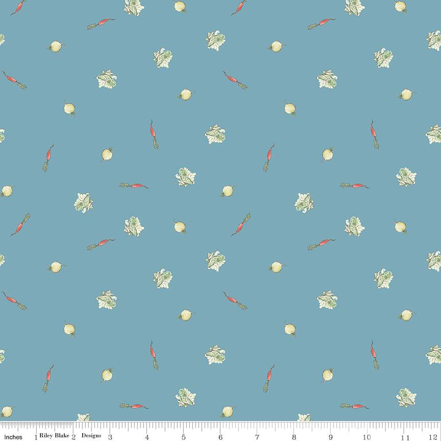 The Tale of Peter Rabbit collection for Riley Blake Designs is great for quilting, apparel and home decor. This print features scattered vegetables. Official licensed product. BEATRIX POTTER™. © Frederick Warne & Co., 2023. All Rights Reserved.